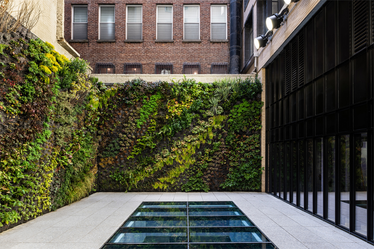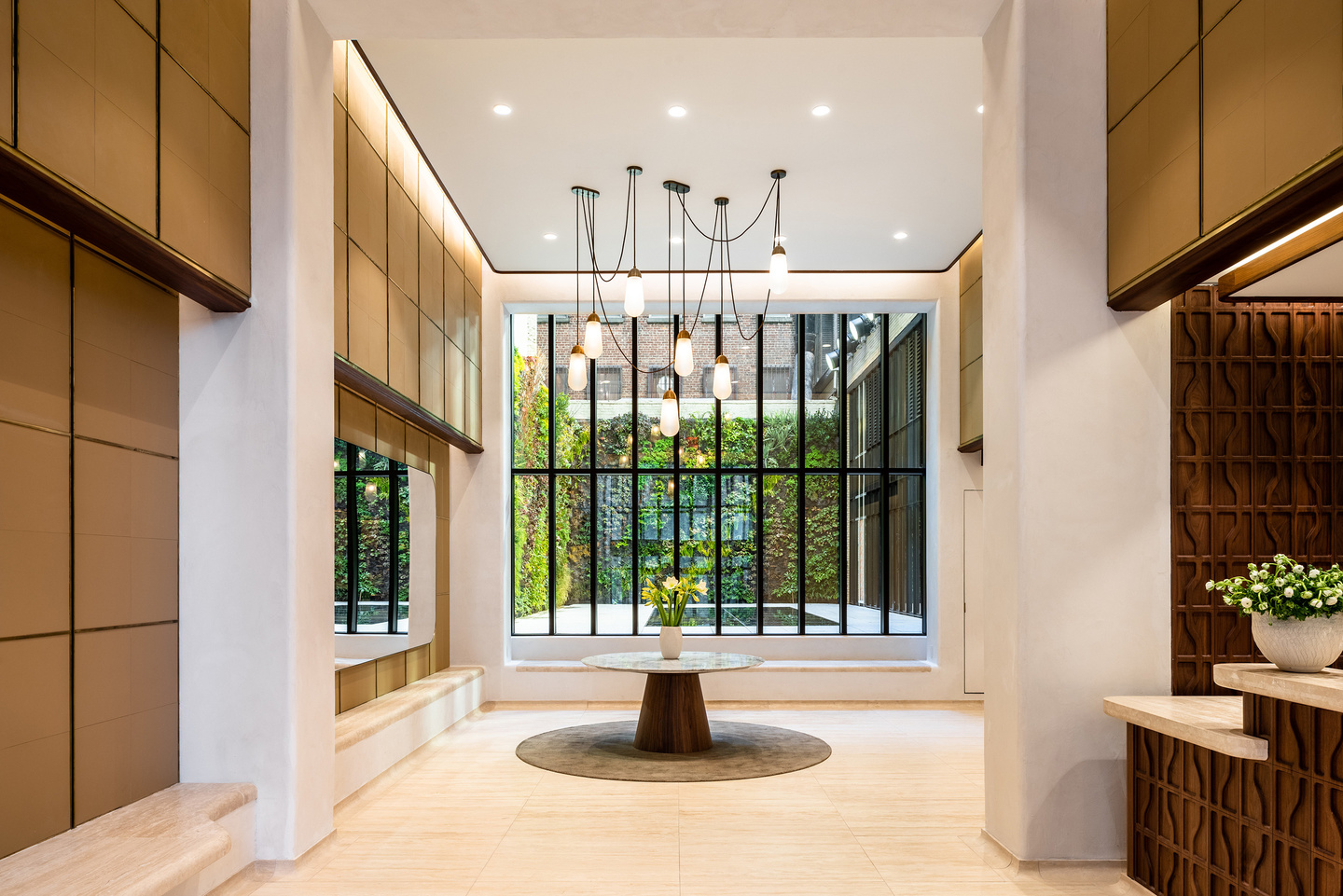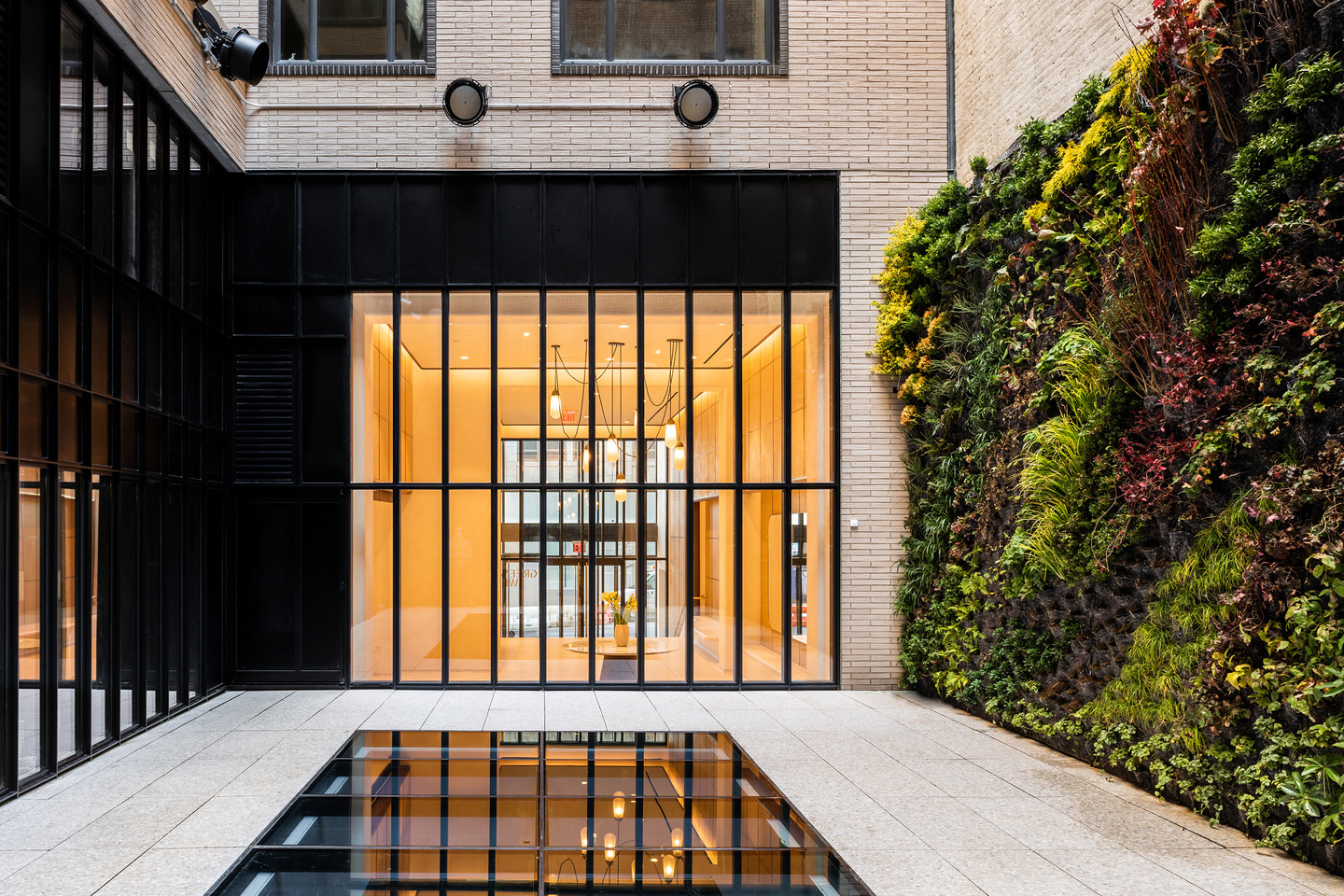 A grand stairway leads up to a generously proportioned lobby fitted in white travertine, rosewood millwork, with wall panels in natural leather. Double-height windows from the lobby frame a dramatic view of internationally acclaimed French botanist Patrick Blanc’s monumental vertical garden sculpture.
