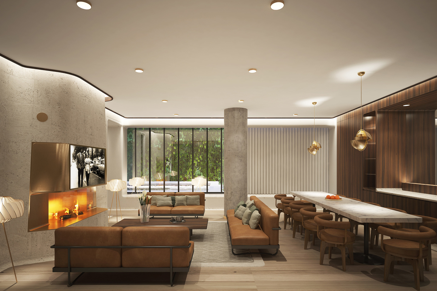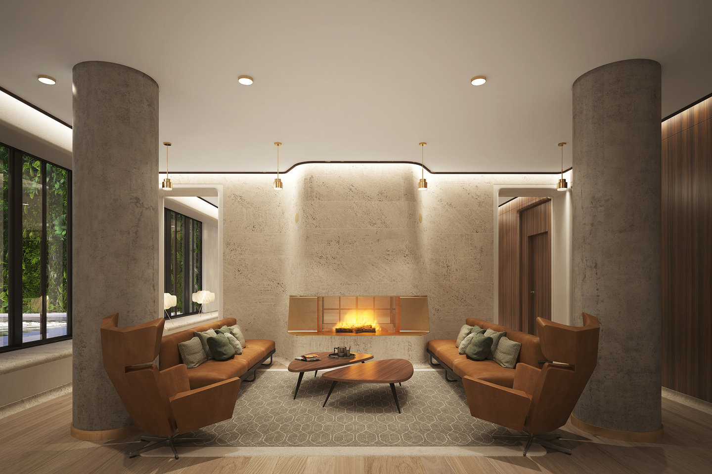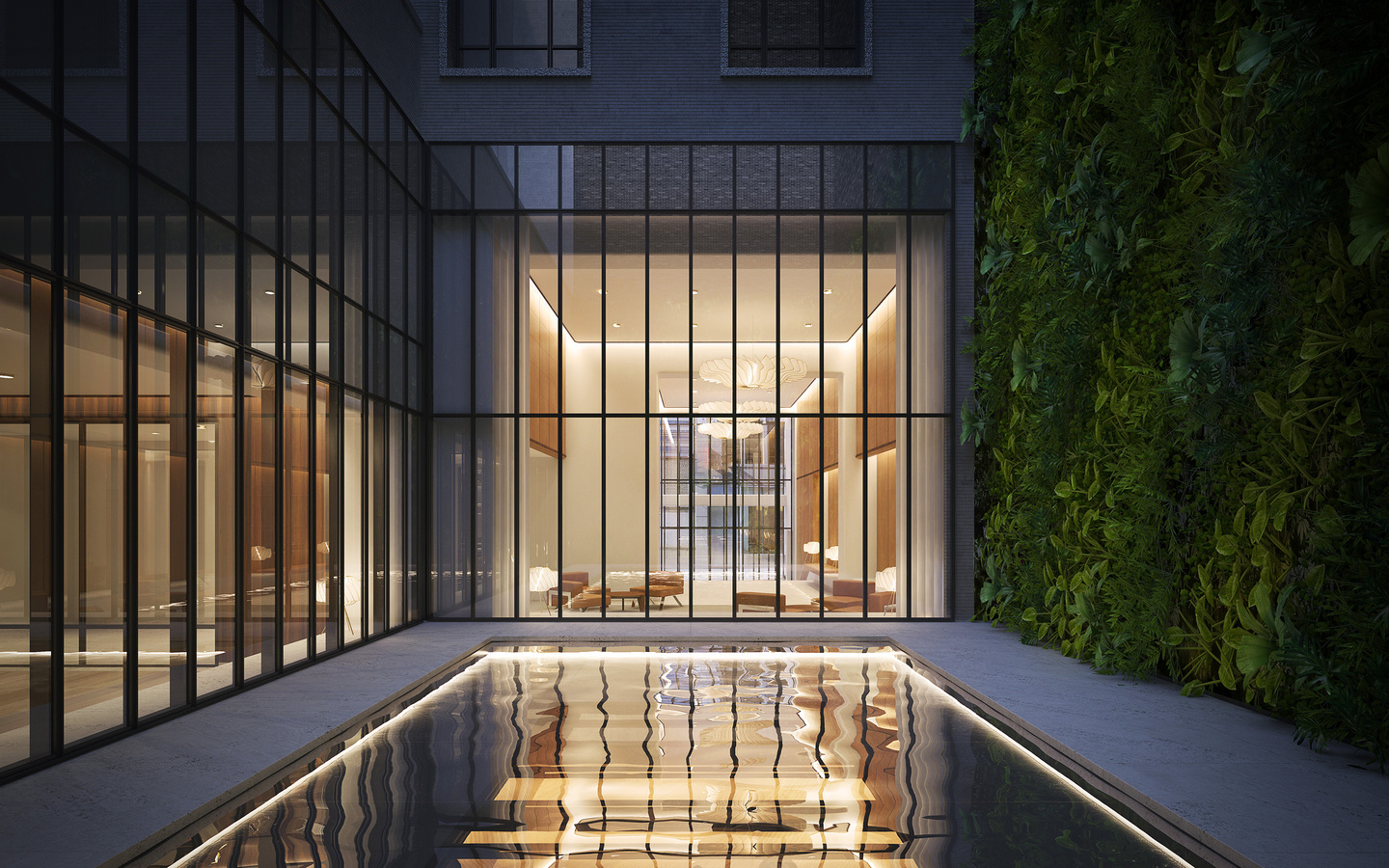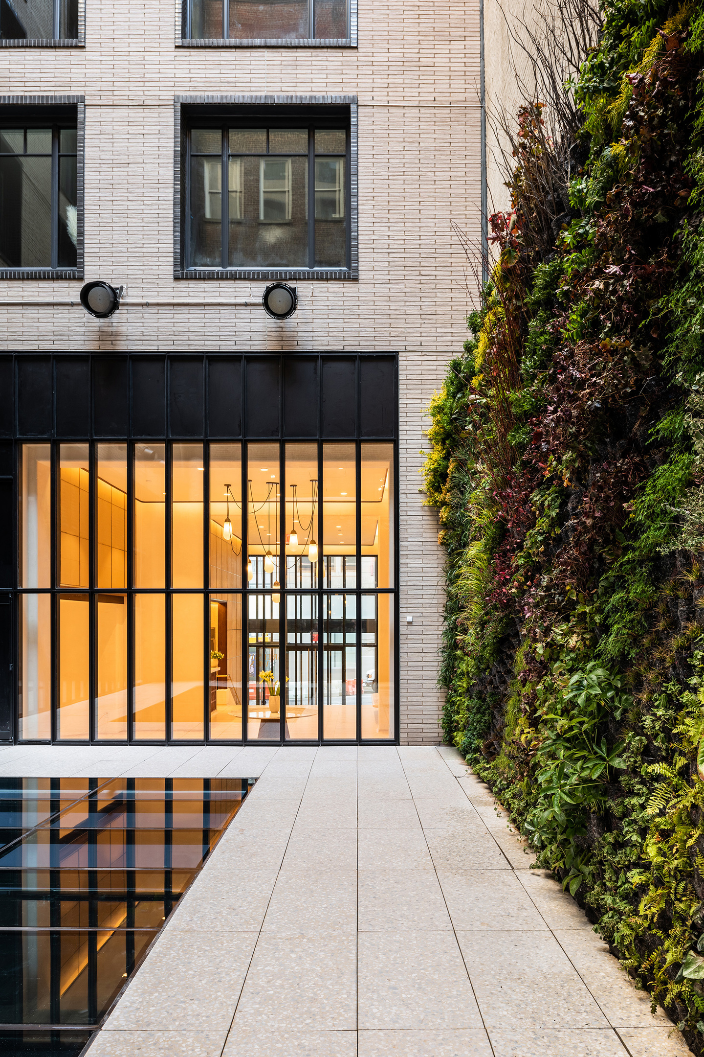 A grand stairway leads up to a generously proportioned lobby fitted in white travertine, rosewood millwork, with wall panels in natural leather. Double-height windows from the lobby frame a dramatic view of internationally acclaimed French botanist Patrick Blanc’s monumental vertical garden sculpture.