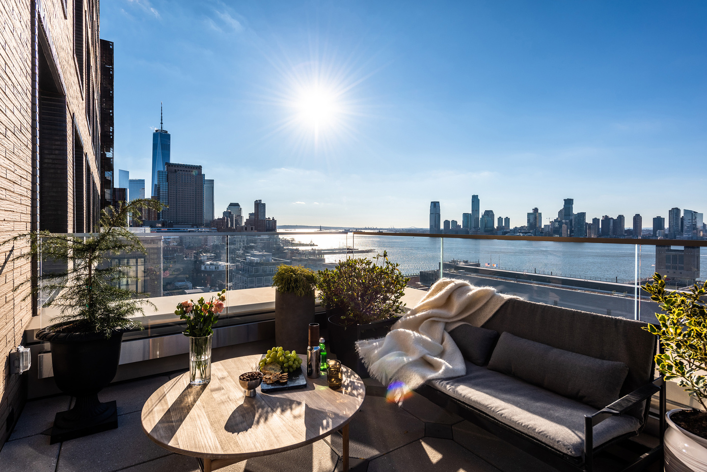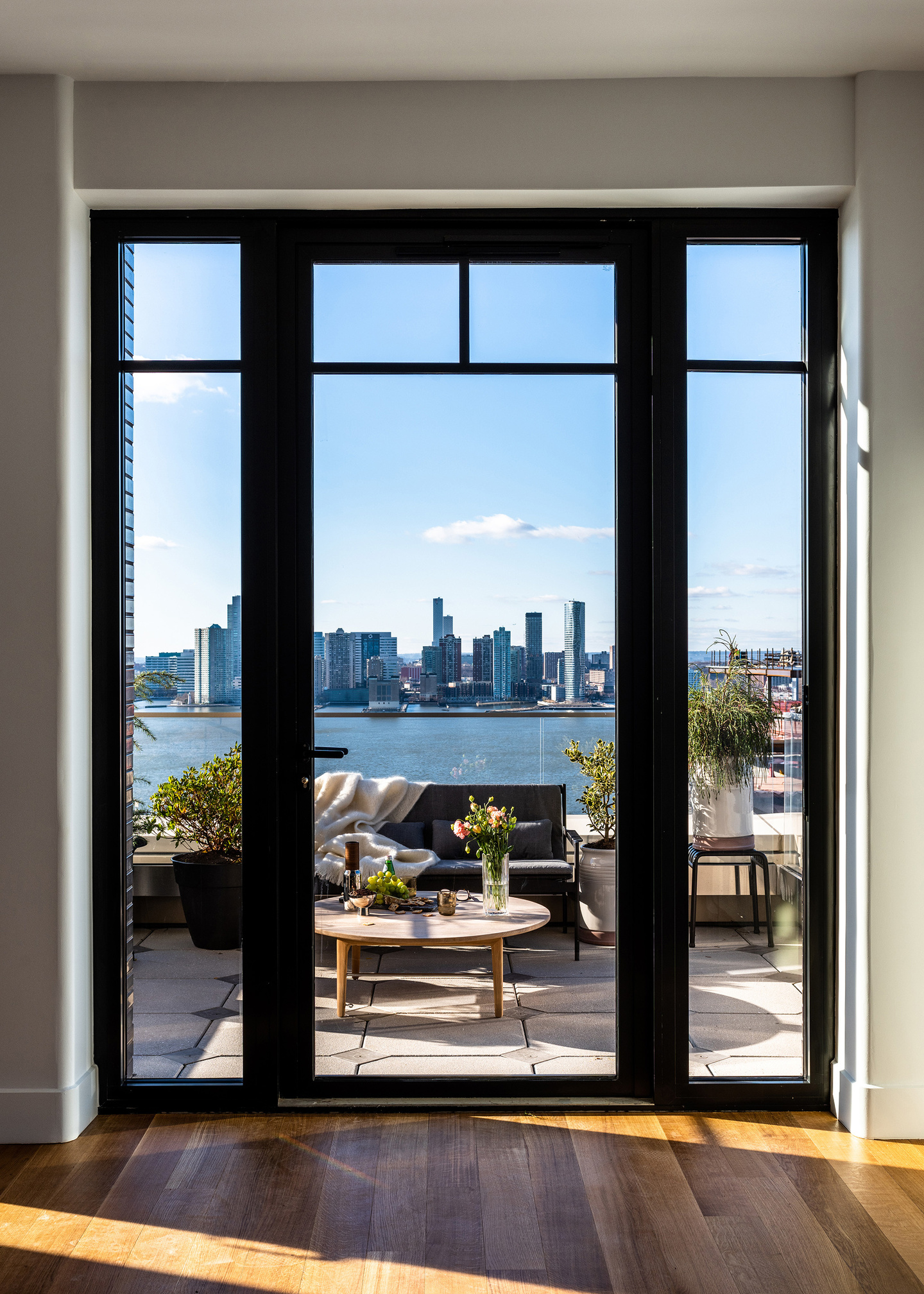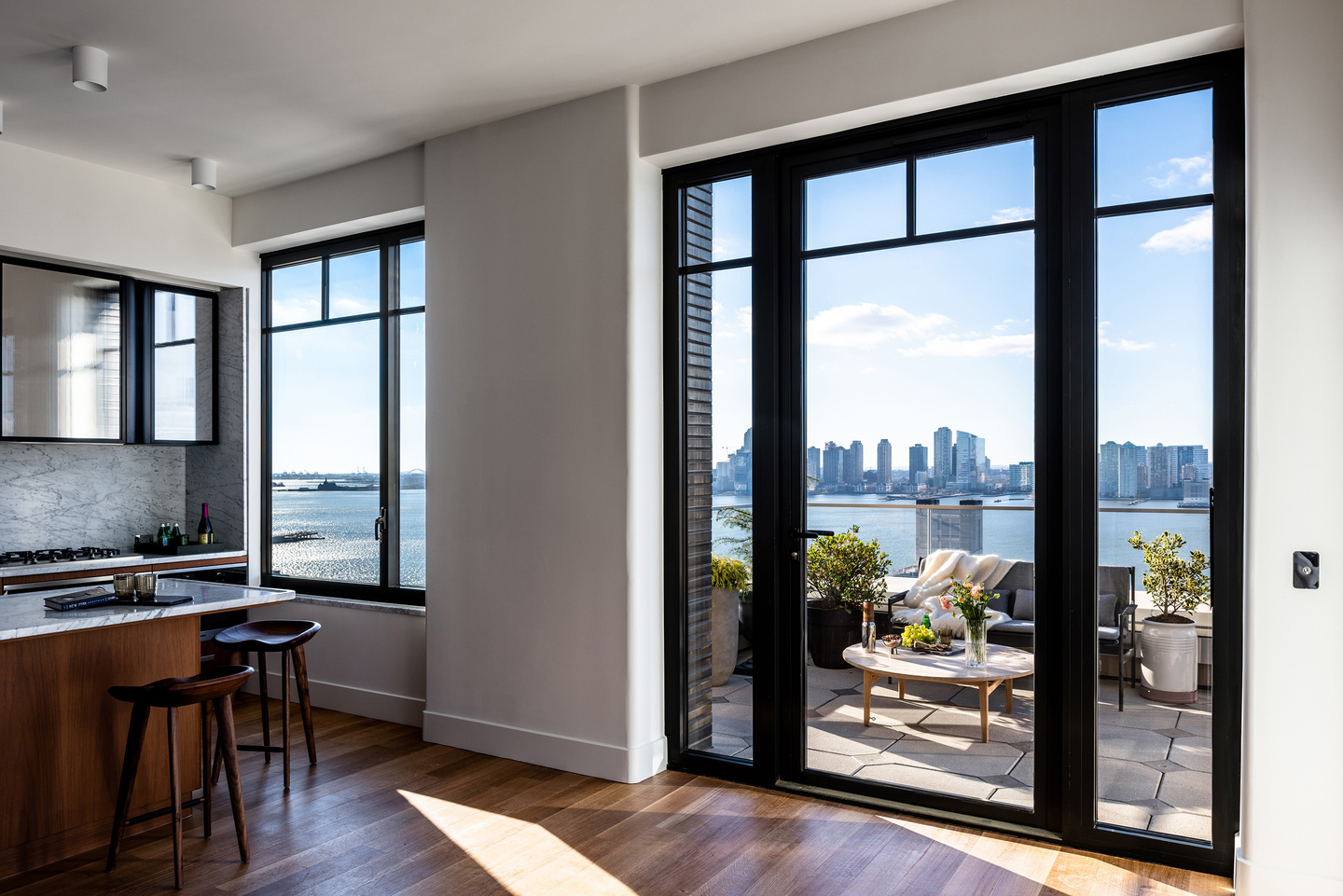 The building’s signature Atelier style windows overlook views of Manhattan and the Hudson River.