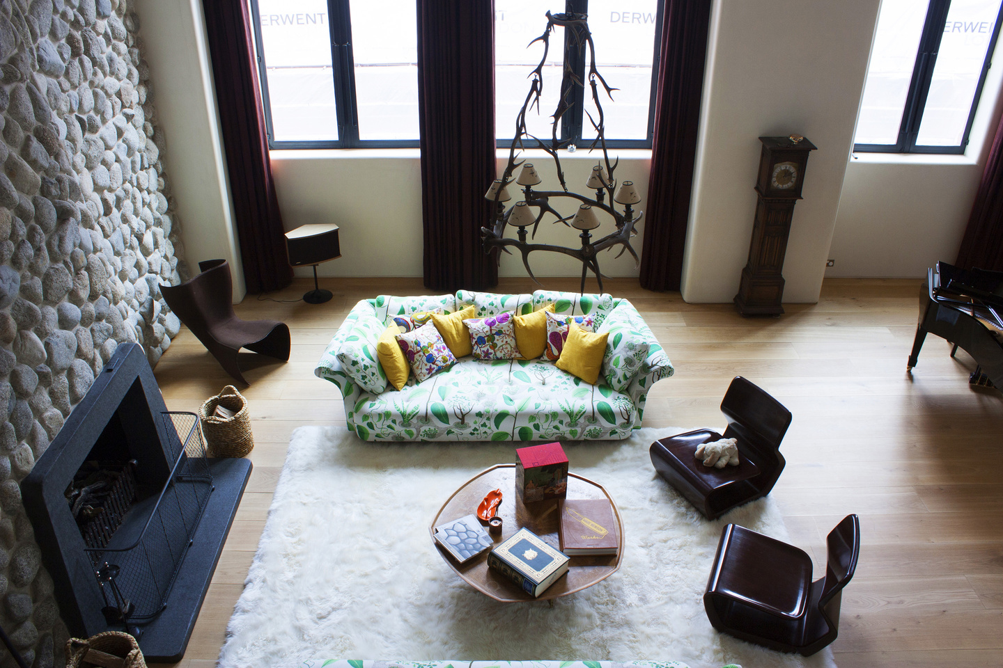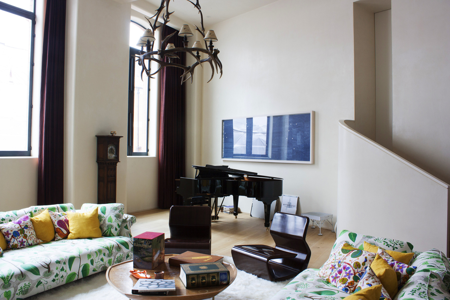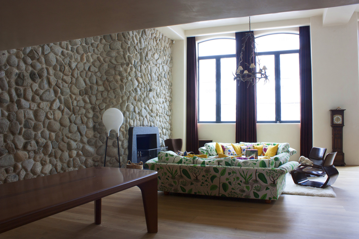 An old Post Office dating back to 1894 in the Victoria District, near Buckingham Palace, has been housing for some years art galleries, artists, stylists, etc. The challenge for Sébastien Segers is to design very fluid spaces inside this Victorian building. The 300 square metres flat has very few right angles and has only eight windows. The Architect creates two volumes, one being 5,50 metres high and the other one 4 metres. The first volume has a free open layout where are located the sitting room, the dining room and the kitchen. A mezzanine creates an extra level. Tradition and contemporaneity are mixed with no inhibition. A huge pebble wall, as a reference to the American villas of the 50’s, an ancient type of parquet made of solid oak large lathes and a chimney bring warmth to this large area, the walls are coated with a plain rendering. The furniture in the kitchen is pastel green lacquer: this colour is one of the colours of the range of colours prepared by Marc Newson for Smeg. A huge marble worktable connects the sitting room area to the kitchen.