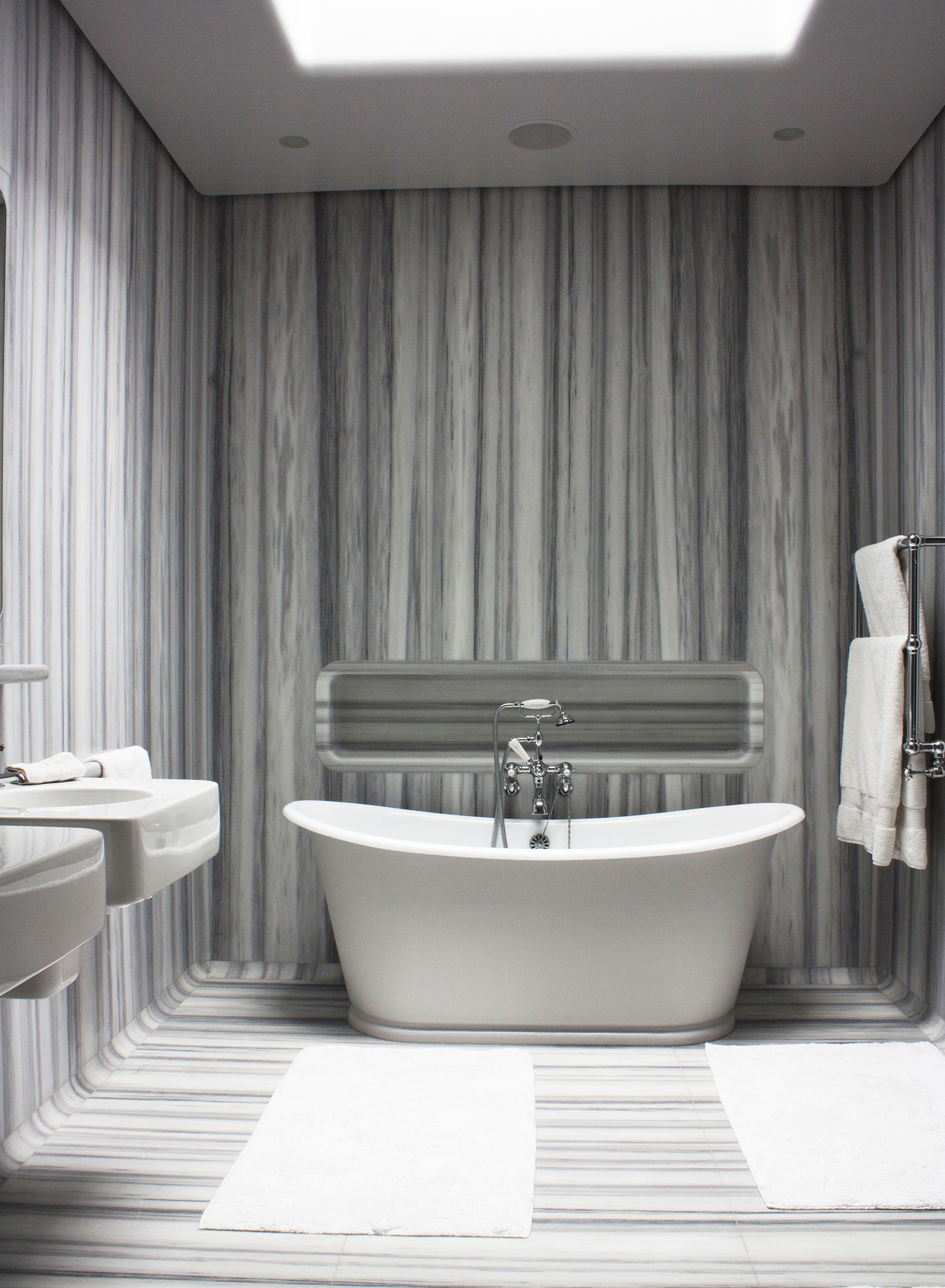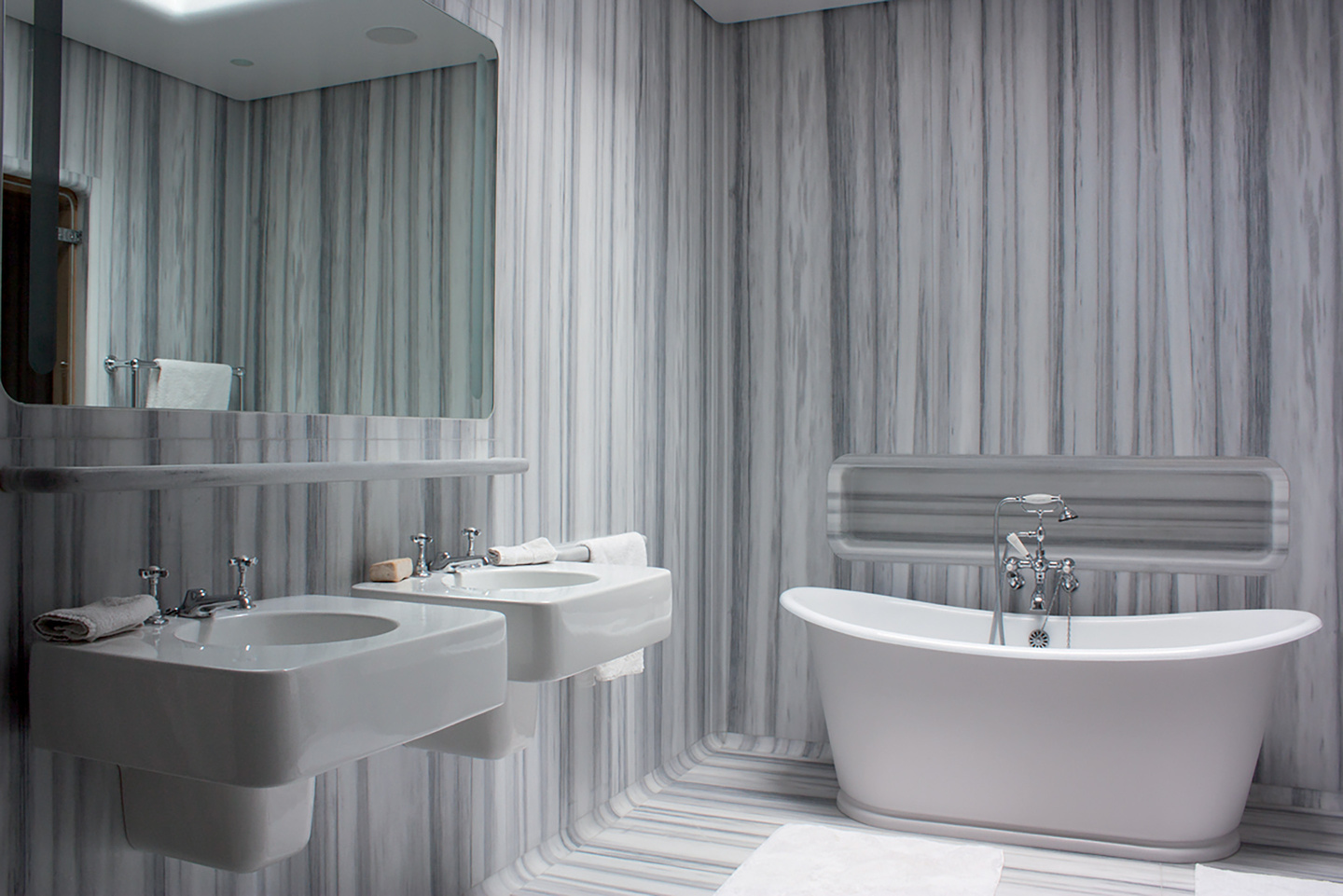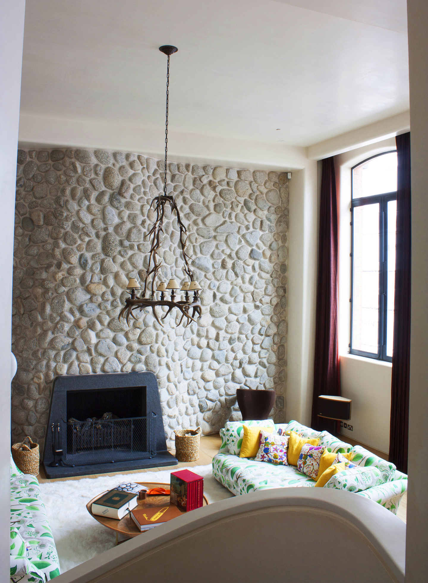 An old Post Office dating back to 1894 in the Victoria District, near Buckingham Palace, has been housing for some years art galleries, artists, stylists, etc. The challenge for Sébastien Segers is to design very fluid spaces inside this Victorian building. The 300 square metres flat has very few right angles and has only eight windows. The Architect creates two volumes, one being 5,50 metres high and the other one 4 metres. The first volume has a free open layout where are located the sitting room, the dining room and the kitchen. A mezzanine creates an extra level. Tradition and contemporaneity are mixed with no inhibition. A huge pebble wall, as a reference to the American villas of the 50’s, an ancient type of parquet made of solid oak large lathes and a chimney bring warmth to this large area, the walls are coated with a plain rendering. The furniture in the kitchen is pastel green lacquer: this colour is one of the colours of the range of colours prepared by Marc Newson for Smeg. A huge marble worktable connects the sitting room area to the kitchen.