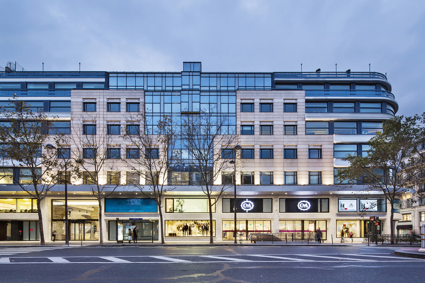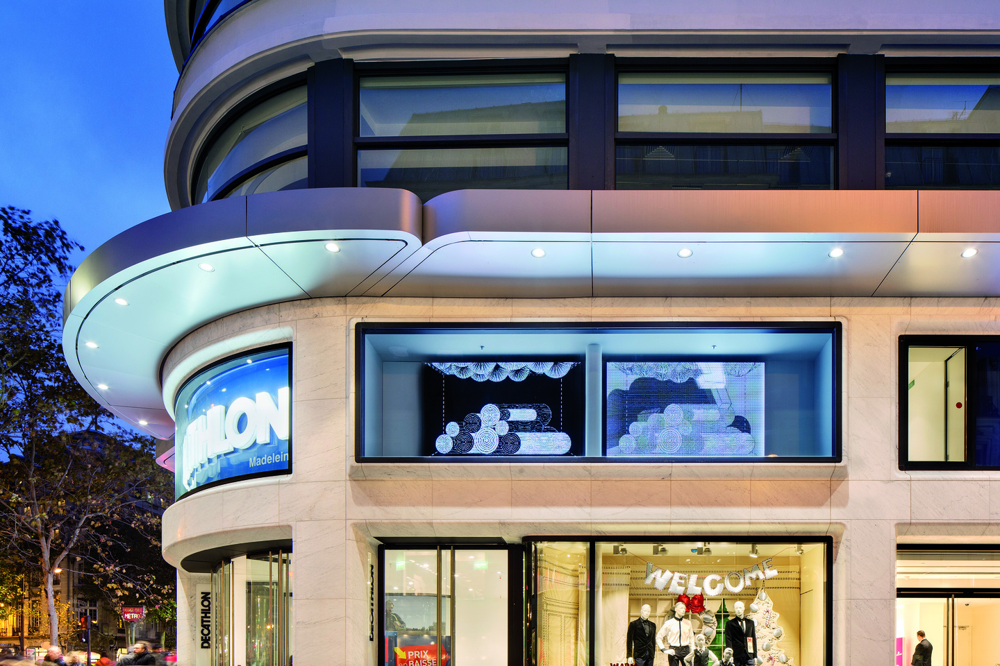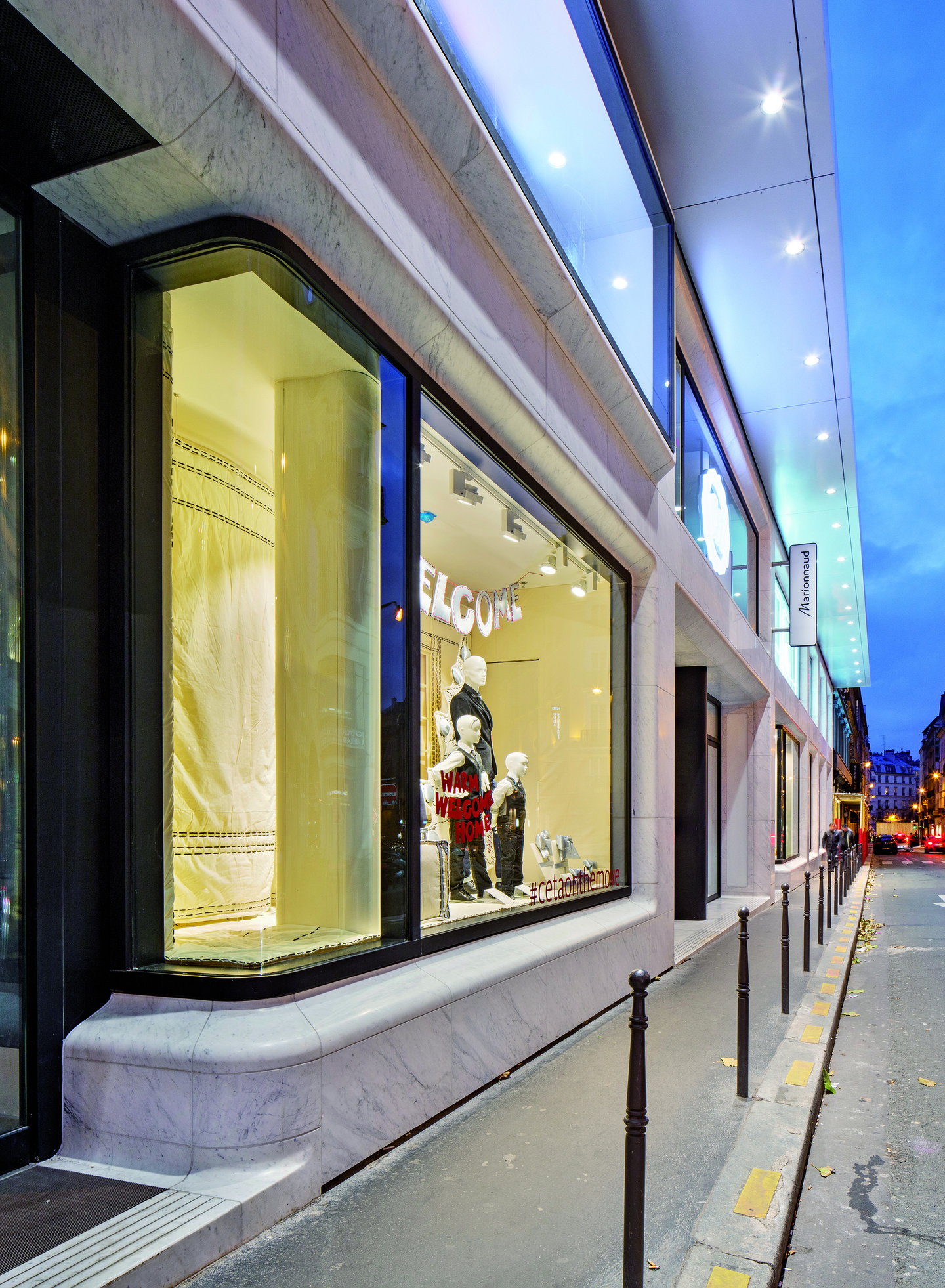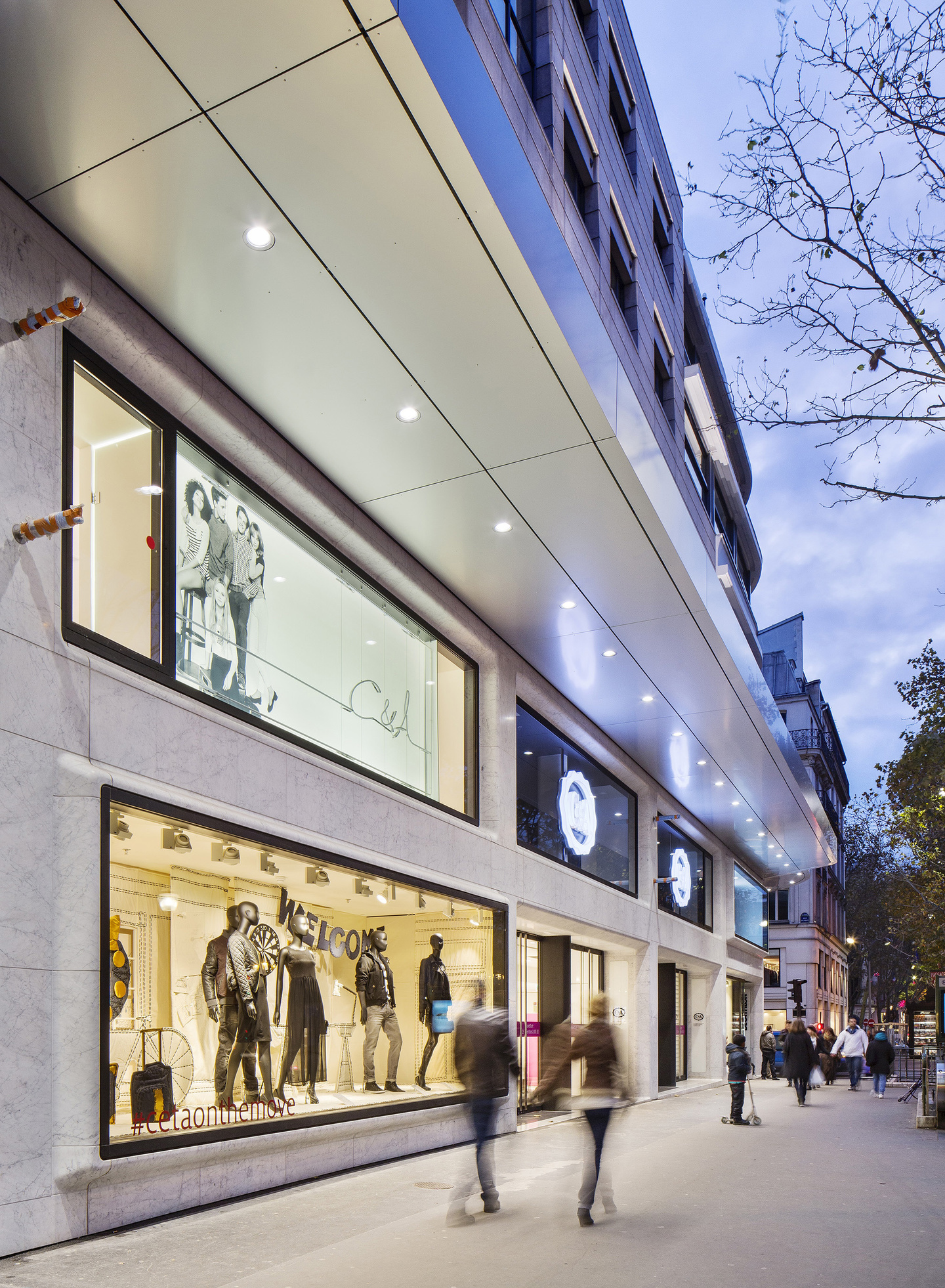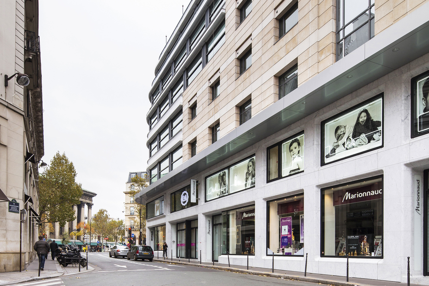 Very large horizontal show windows, with glazed panels measuring up to eight metres, have lead the Architects to modify the structure of the building. Therefore they have reduced the dimensions of the concrete facade columns and one column out of two has been deleted. These have been replaced by a steel column located behind the show window. This design of the proportions based on the typology of the retail shops of the end of the nineteenth century has convinced the “Architecte des Bâtiments de France” who has approved of this totally contemporaneous facade
