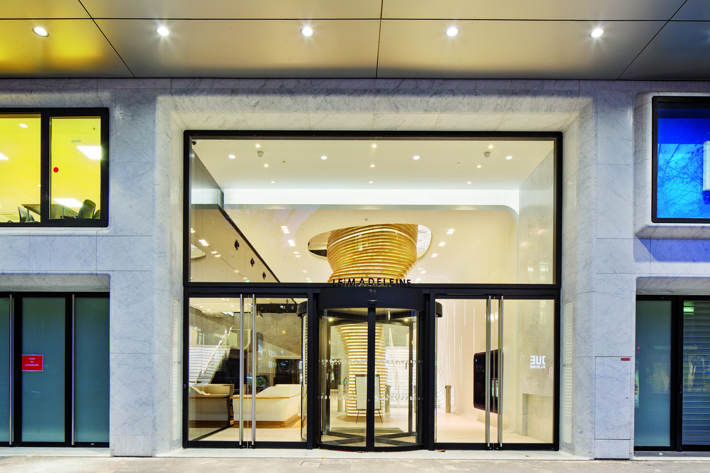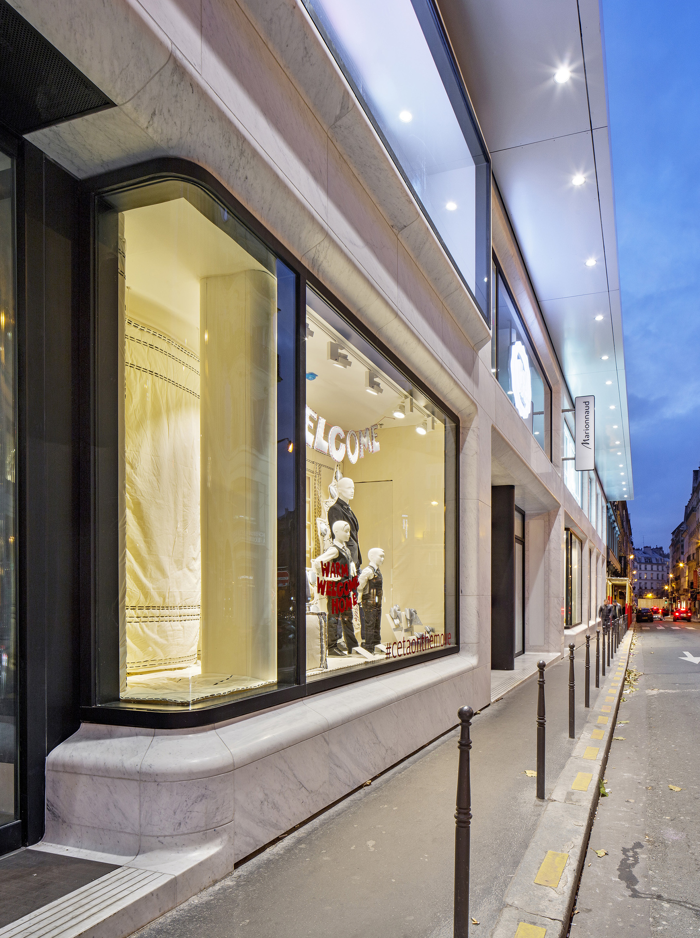 The new facade is cladded with bright Carrare marble from the Quarry of “Campanili Marbles” and looks like a sculpted monolith. It is made of the assembly of thousands of elements, all precisely designed, modelised and numbered in three dimensions for a perfect fitting. This sensual mineral mass, with a fine rubbed finish, includes both flat and curved surfaces and protruding and recessed show windows. An abyss setting of the profiles of the ogees, in and out, ensures that the whole assembly has an aesthetical homogeneity.