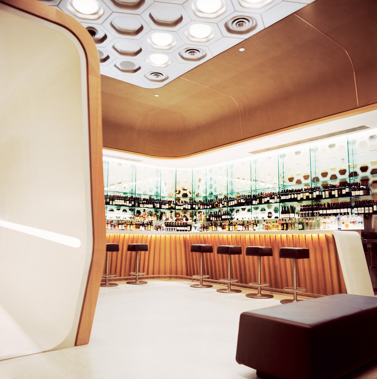 The audacious mix of materials creates a timeless atmosphere; The traditional Japanese kyokabe coating used in the tea houses (a mix of plaster and straw) covers the walls of the main room. The entrance tunnel, inspired by the Stanley Kubrick film: 2001, A space Odyssey, the bar and the cubicles are made of a Corian® type thermo-moulded resin. All the finishings and the equipment are designed and custom made for the Project: the bar, the ceiling, the wood and leather furniture manufactured in Italy, the honeycomb network carpet, the mirror with a variable sanding featuring the hexagonal motive favoured by Newson.