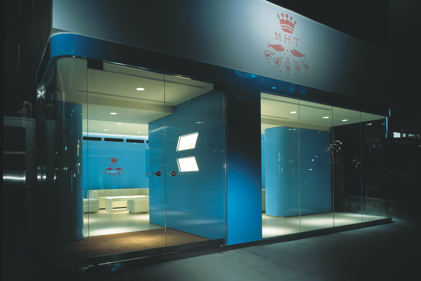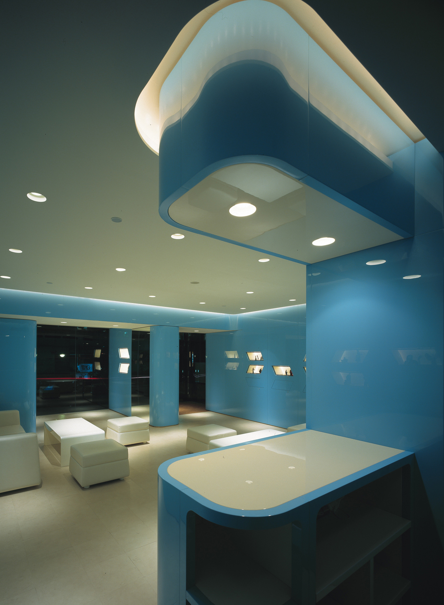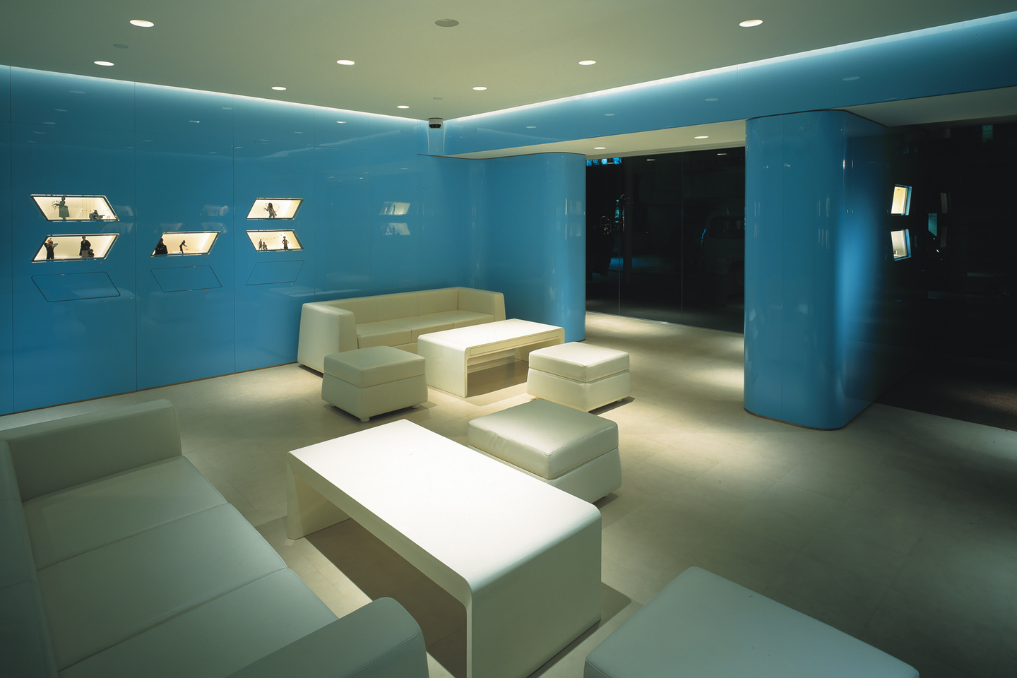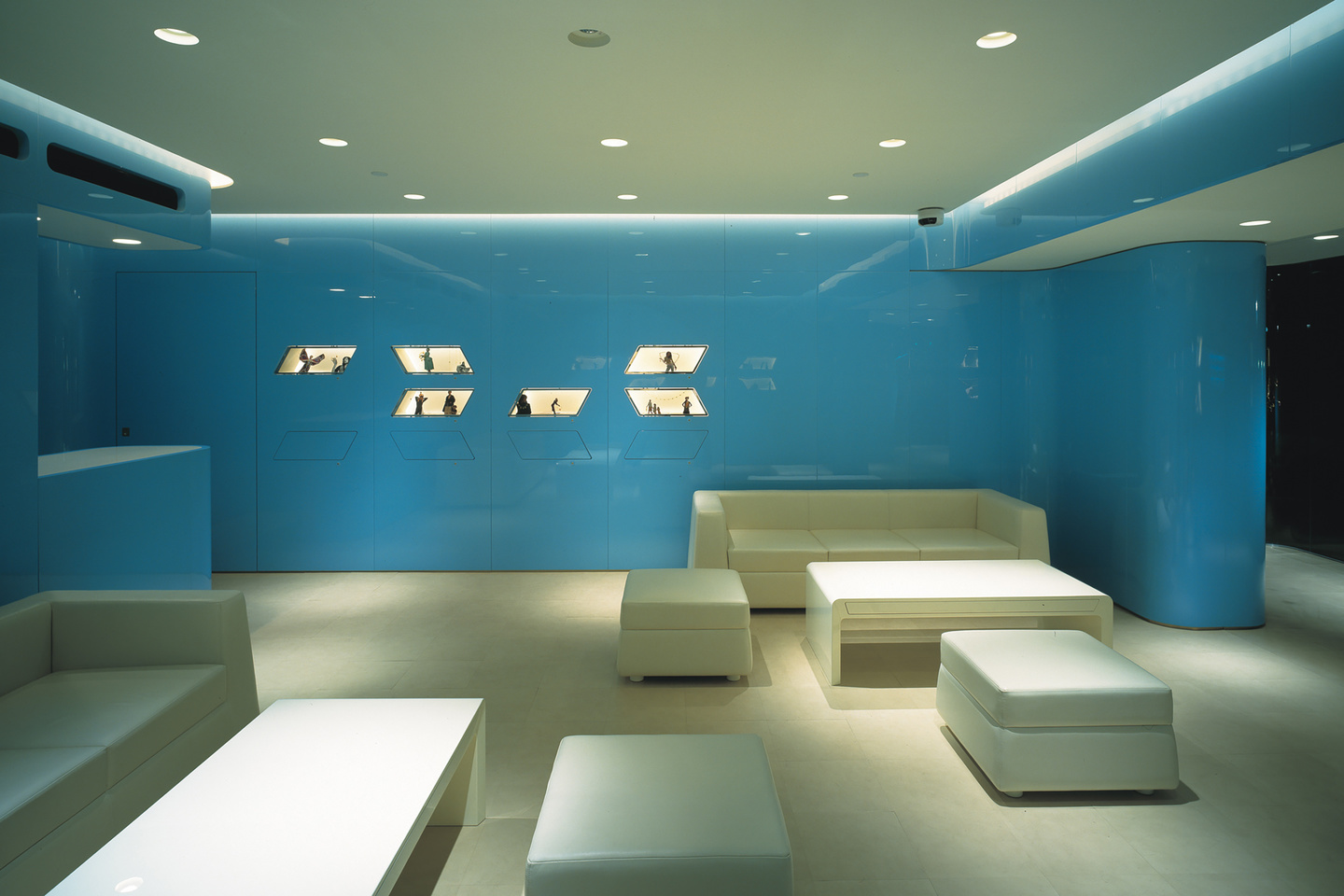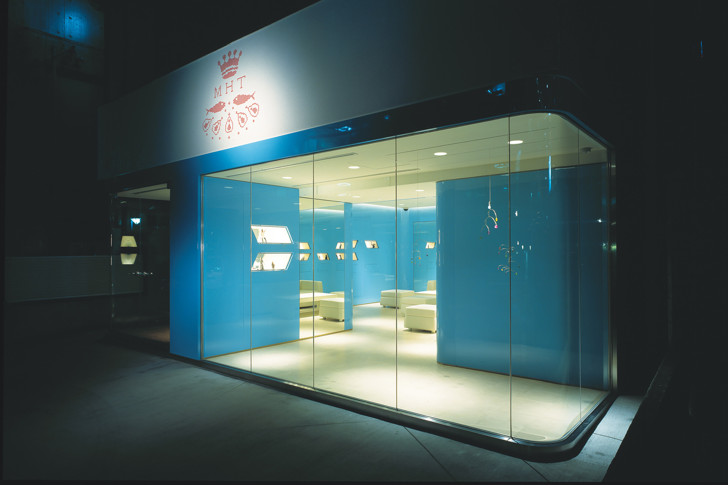 In the heart of the Aoyama district, a true test area for architecture and design, the shop of the jewel designer Marie- Hélène de Taillac contrasts strongly with its minimal aspect. It is located on the ground floor of a small two level building. Having cleaned, as much as possible, the given space, the Architect and the Designer have installed a large U shape show window, with rounded angles, only keeping one column along the facade. The assembly is topped with a strip cladded with small white ceramic tiles in which appears the red ceramic logo of the jewel designer.