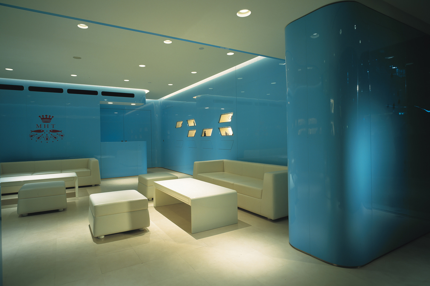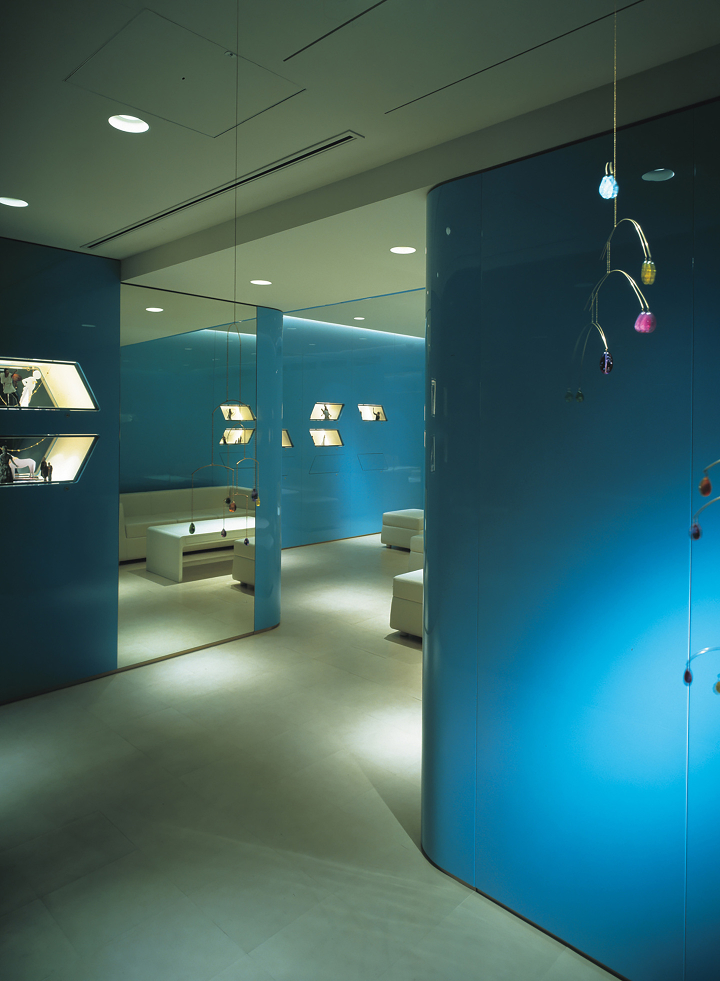 Sébastien Segers has applied the Feng Shui principles to the Project. Therefore the energies can easily flow. There is no area where the customer may feel blocked. The walls, with rounded angles, are coated with a blue shining lacquer. The floor is covered with white leather. This leather is also used for the Marc Newson furniture that marks the premises. This case, quite disconcerting by its bareness, conceals the jewels of Marie-Hélène de Taillac in drawers set under mystifying small lit holes housing tiny figures.